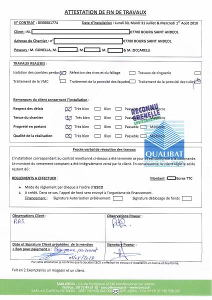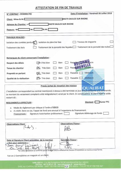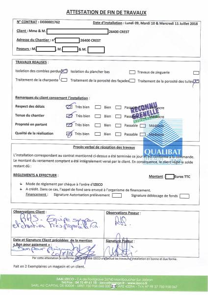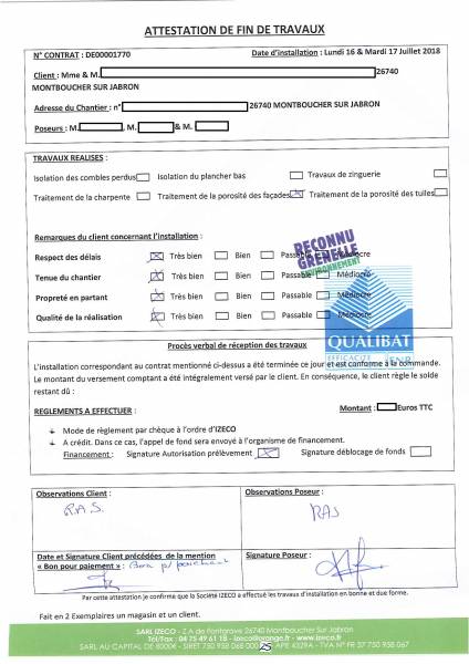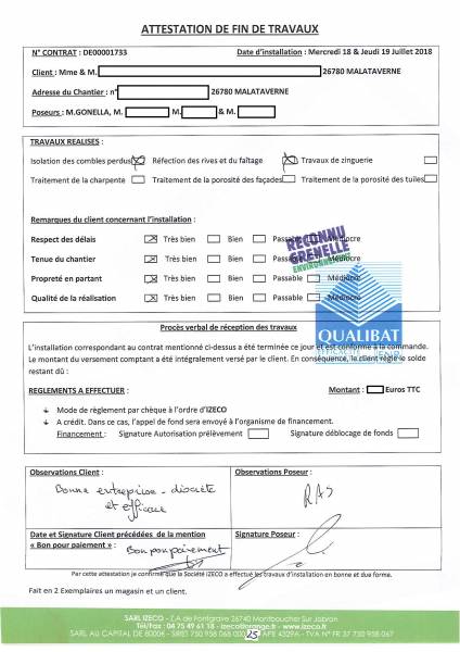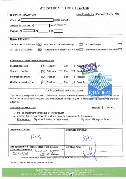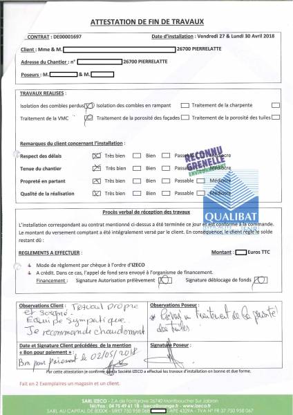avis des clients. IZECO publie les attestations de fin de chantier complétées librement par ses