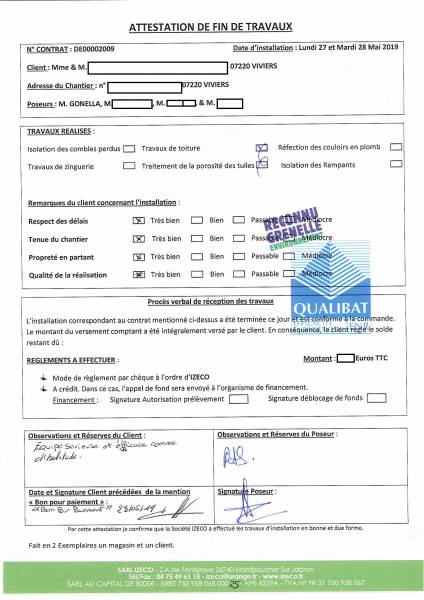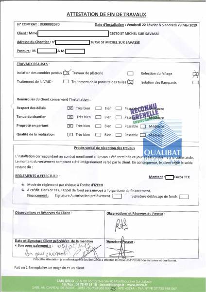 clients. Cette attestation de fin de chantier est obligatoire et complétée librement par nos